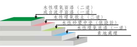 ②水性環(huán)氧底漆:只要不積水或不明顯滲漏就可施工,具有一定透水氣功能,能增強(qiáng)素地強(qiáng)度及增加涂層封素地的附著力; ③水性環(huán)氧中涂:將水性環(huán)氧樹(shù)脂加入適量石英砂,用鏝刀將其均勻涂布一道,用于增加厚度及涂層抗壓強(qiáng)度;
